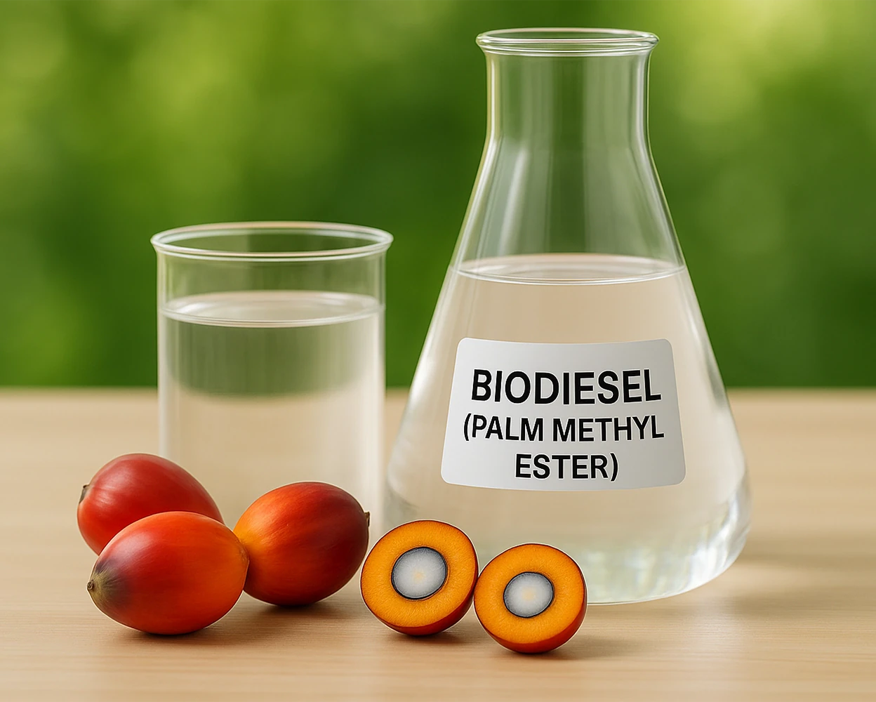 เชื้อเพลิงเหลวที่ได้จากการนำน้ำมันปาล์มบริสุทธิ์ มาทำปฏิกิริยาทางเคมีทรานเอสเทอริฟิเคชั่น (Transesterification) ร่วมกับเมทานอล จนเกิดเป็นสารเอสเตอร์ที่มีคุณสมบัติใกล้เคียงกับน้ำมันดีเซล เรียกว่า “ไบโอดีเซล” หรือ “B100” มีลักษณะสีขาวใส มีคุณสมบัติการเผาไหม้เหมือนกับดีเซลจากปิโตรเลียมมาก และสามารถใช้ทดแทนกันได้ ซึ่งการใช้น้ำมันไบโอดีเซล จะช่วยลดมลพิษทางอากาศ เพราะสามารถย่อยสลายเองได้ตามกระบวนการชีวภาพในธรรมชาติ โดยไม่เป็นพิษต่อสิ่งแวดล้อม